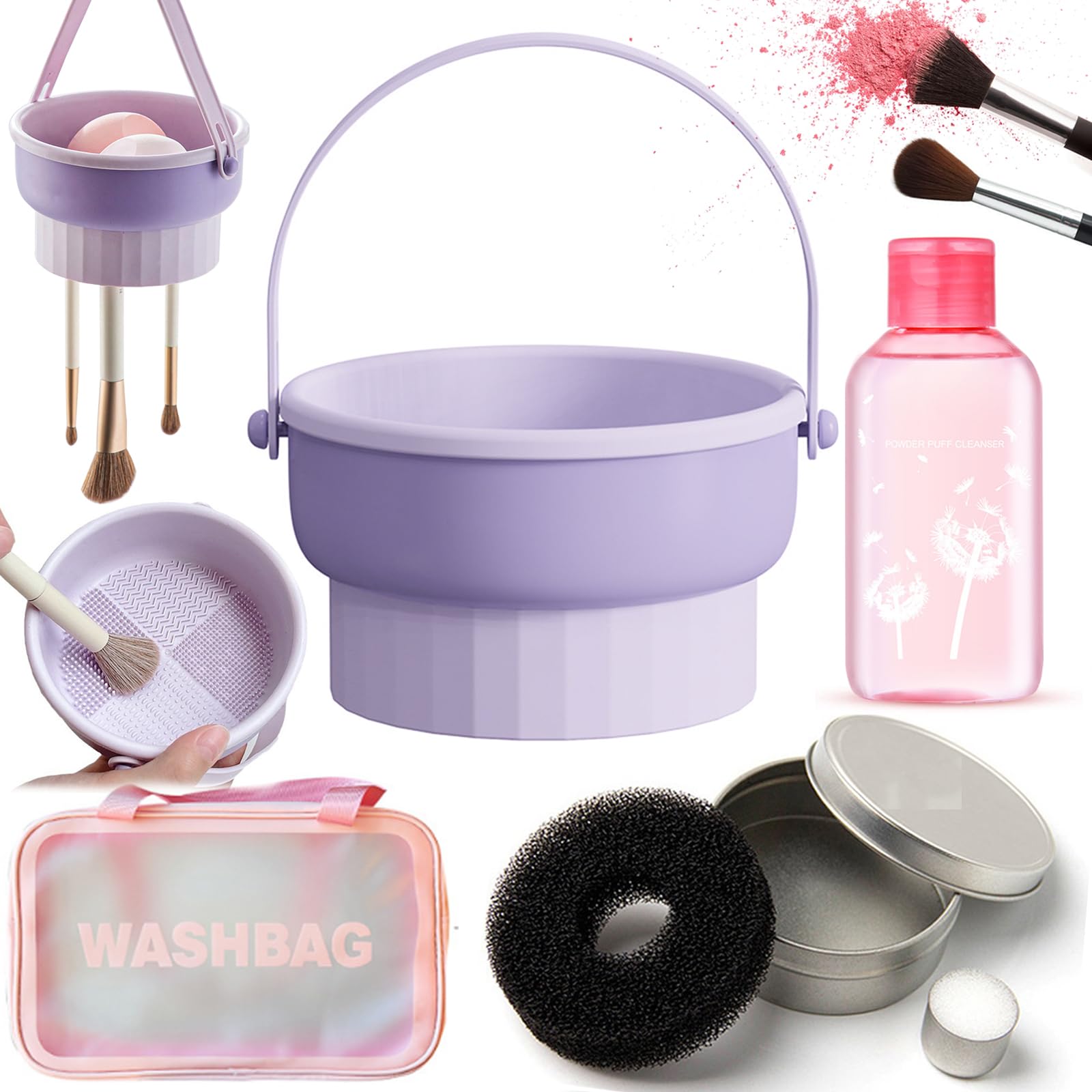 3 In 1 Makeup Brush Cleaning Set Multifunctional Washing Bowl Drying Basket with Handle Silicone Cleaner Mat Removal Cleaner Sponge 150ml/5.12fl.oz Professional Makeup Brush Cleaner