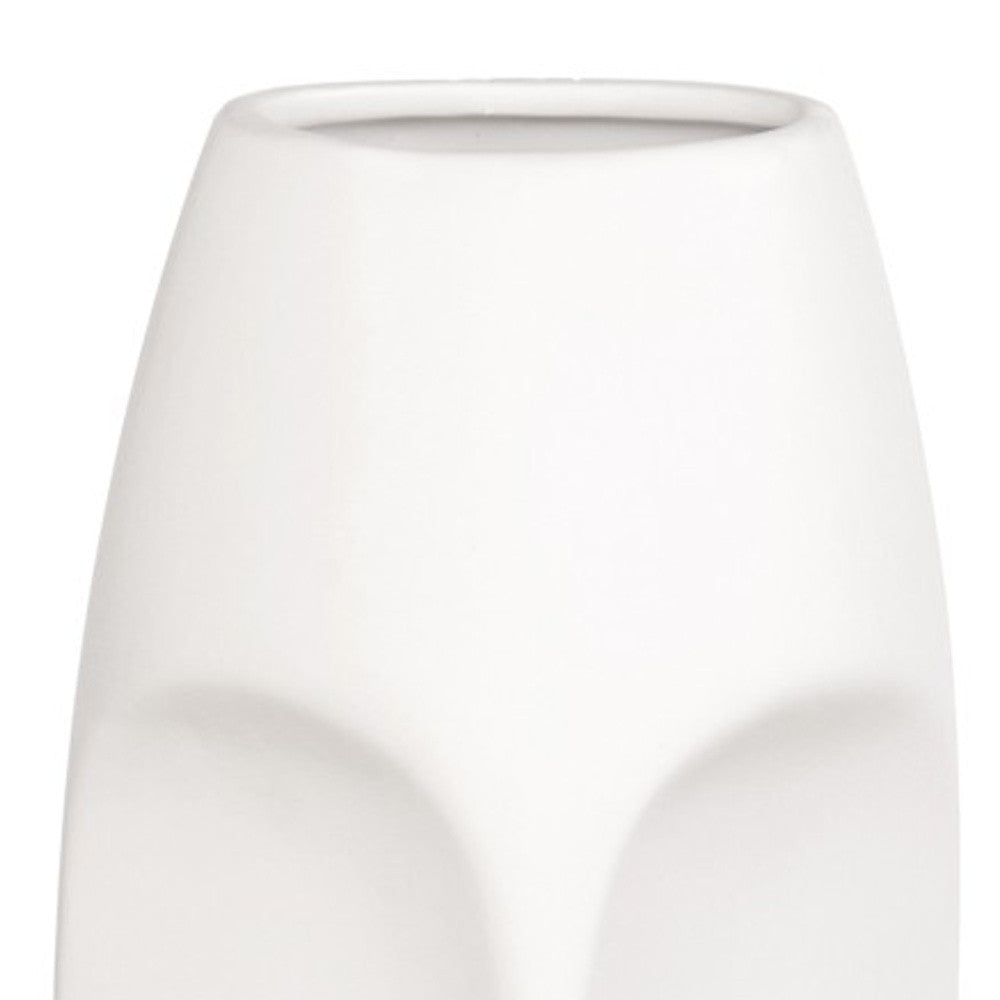 This ceramic vase is characterized by non descript contemporary face. It is then finished in a matte white glaze giving the piece a modern and mysterious look. Alone or in multiples, It is a perfect focal point for an entryway, bathroom, bedroom or any room in your home. Hardware is affixed to the back of the piece so it is ready to hang right out of the box!