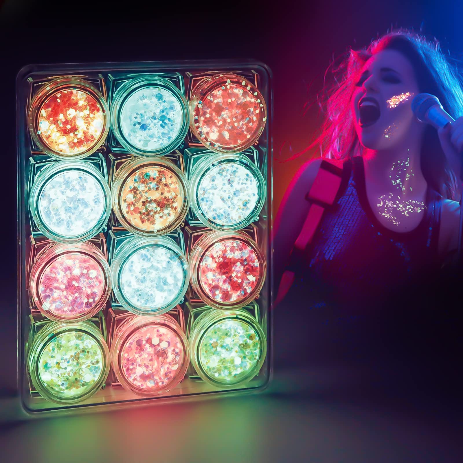 Glow in The Dark Body Glitter Gel, 12 Colors & Shapes Glitter Gel Makeup, UV Body Glitter for Women, Glow in The Dark Face Glitter Makeup Gel, Chunky Glitter Makeup for Party Rave Festival Accessories