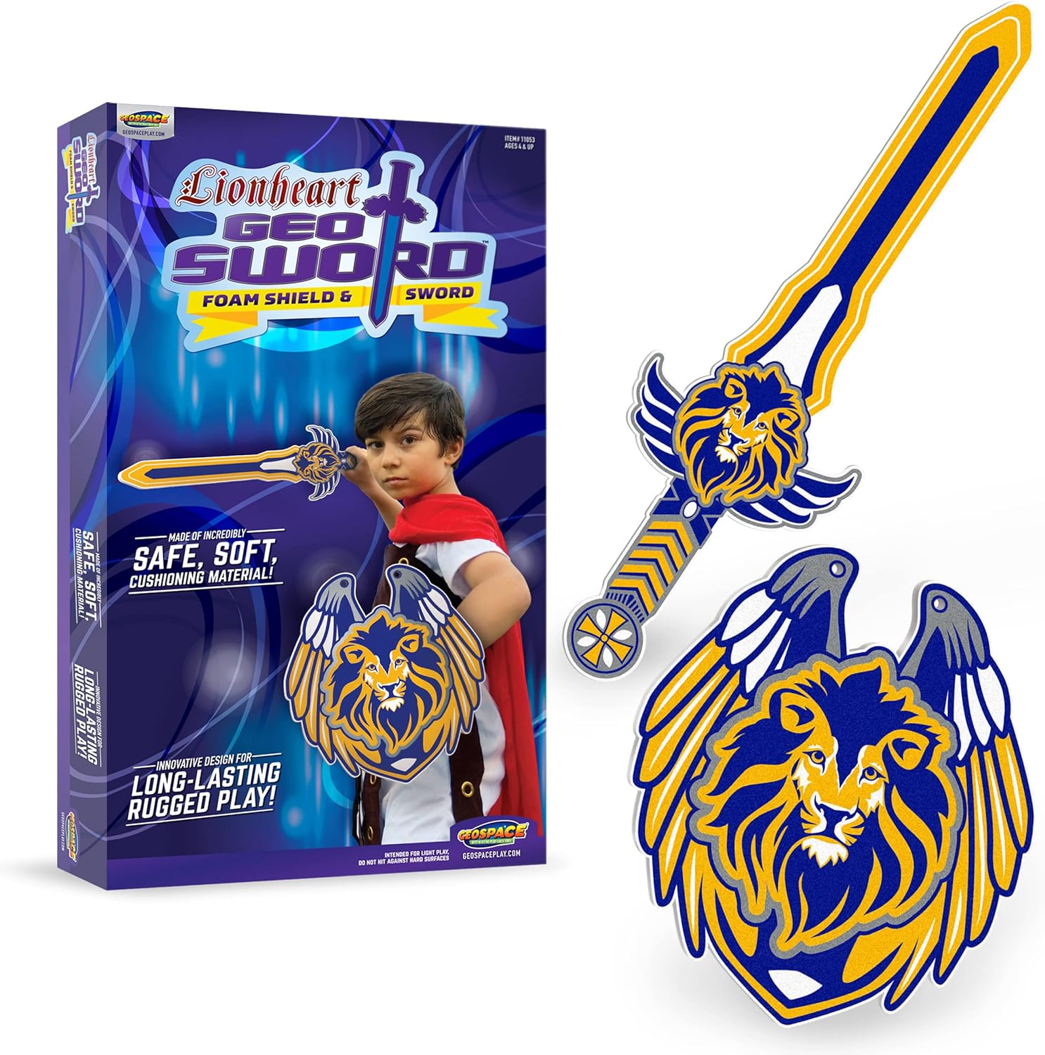 GeoSword™ LionHeart Soft Shield & Sword Set is made of lightweight, super-safe soft yet durable rigid foam. It is designed as a medieval-style sword for realistic battle play action! Includes 1 soft foam sword that measure about 20 inches in length, 7 inches at the width of the handle and 2 inches at the blade, plus 1 shield that can be held with a handle on the inside of the shield. Will not tear or break, however parents should supervise young kids during mock play. For age 3 years and up.