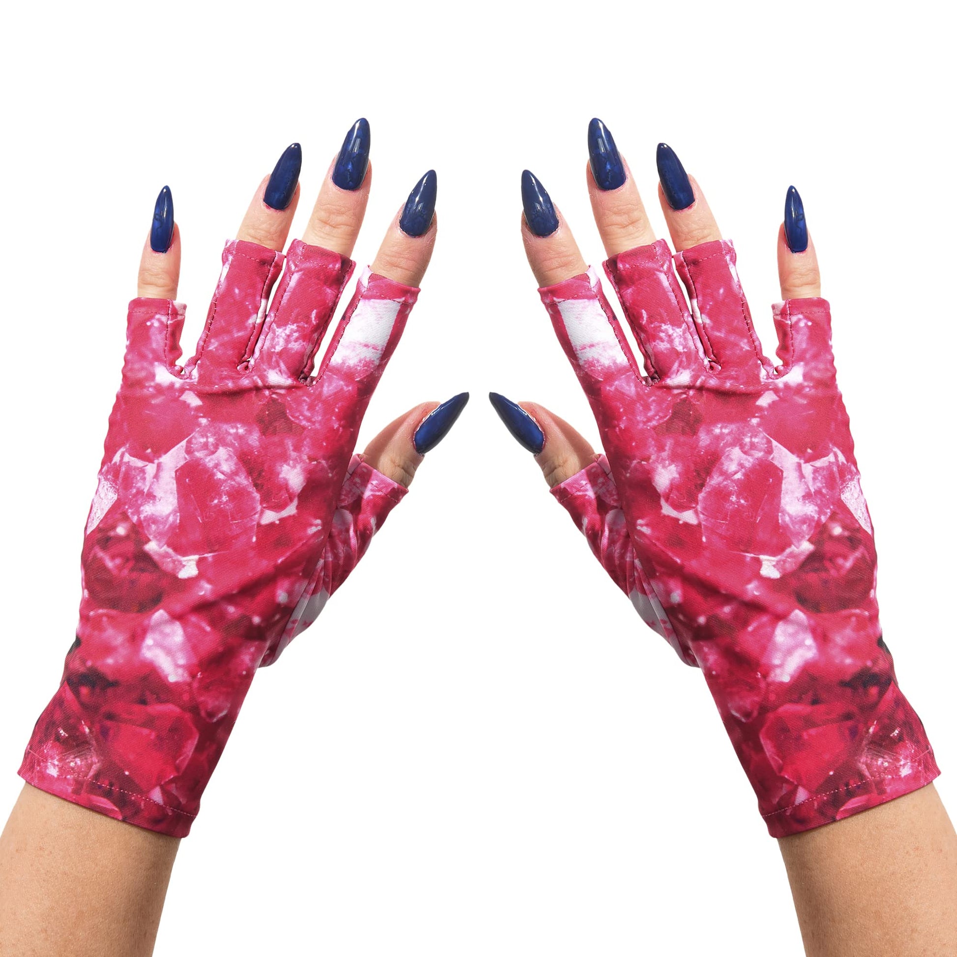 Details: Shield the delicate skin of your hands from the harsh effects of UV rays with ManiGlovz! These anti-UV fingerless UV Gloves for women allow you to get the most out of your mani-pedi sessions, driving or other outdoor activities without exposure risks. For Well-Protected HandsThese gloves’ UPF 50+ protection blocks 98% of all UV and other damaging rays from UV gel polish lamp dryers. Since they are fingerless, they keep your nails exposed while covering the rest of your hands.With UV-Shielding, Skin-Friendly MaterialsMade of Compression Tricot with hydrating Aloe Vera microcapsules, these UV gloves combine polyester super microfibers (82%) and Lycra (18%). That’s why our gloves’ fabric has superb retention capabilities that resist runs while providing a 4-way stretch for added strength.Fits Like a Glove, LiterallyManiGlovz's stretchable fabric fits everyone! Ultralight and water-resistant, they’re indispensable to driving, drying gel manicures with UV nail light and even post-peel or laser surgeries. Regular use helps keep your hands looking and feeling youthful.Comes in Ultra-Chic, Fab PrintsTake your pick from our large selection of fun art prints! Each pair includes a 4 x 6 storage pouch that’s purse-perfect. Sizes and MeasurementsThumb: 25 mmPointer finger: 50 mmMiddle finger: 55 mmRing finger: 50 mmPinky finger: 50 mmMeets UV Fabric StandardsProcessed based on the highest standards of UV fabric rating, our gloves are made to last while providing you with the latest radiation-blocking technology.