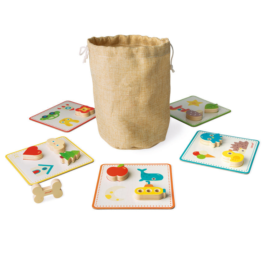 For 2 to 5 players, the Memory Touch Game includes 21 wooden pieces, 5 game cards and a cotton bag for storage. Put your hand inside the bag and try to be the first to find the 4 pieces pictured on your game card using only your sense of touch! But beware of the trick piece! The player who picks the bone must return any pieces already won to the bag and start again. For younger children the variant of the game is that they each pull a piece from the bag to match the images on their card. If not, it is returned for another player to try. An ideal game for developing sensory processing and fine motor skills.