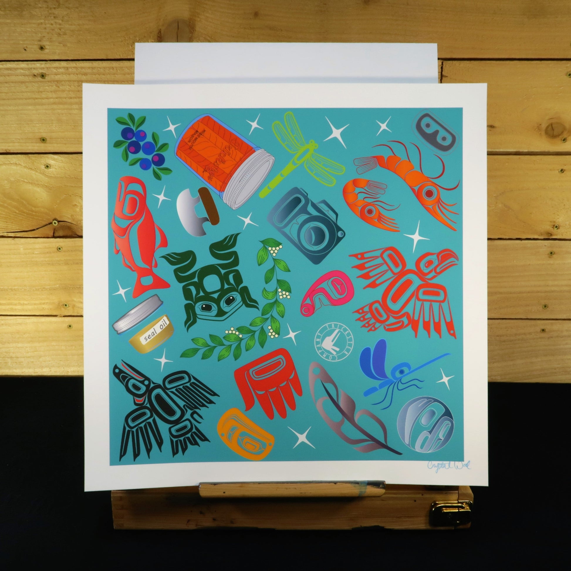High quality giclée print featuring some of Rico and Crystal's most popular designs of things integral to our Indigenous lifestyles. What can you find?