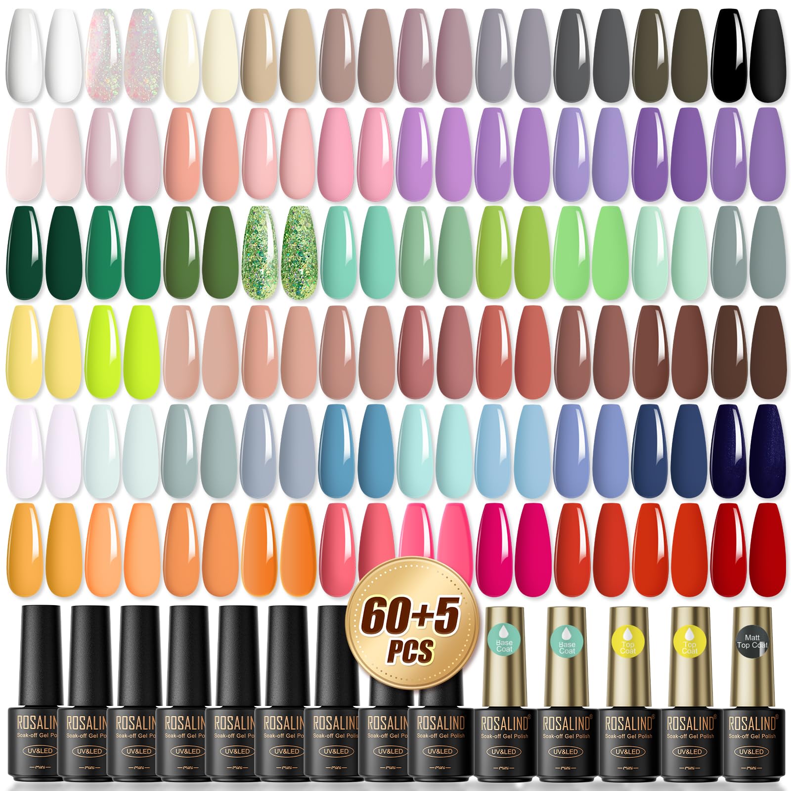 ROSALIND 65 PCS Gel Nail Polish Set, All Seasons Base Coat Matte Glossy Gel Top Coat Nail Gel Polish Set for Starter Manicure DIY at Home Enjoy Fun