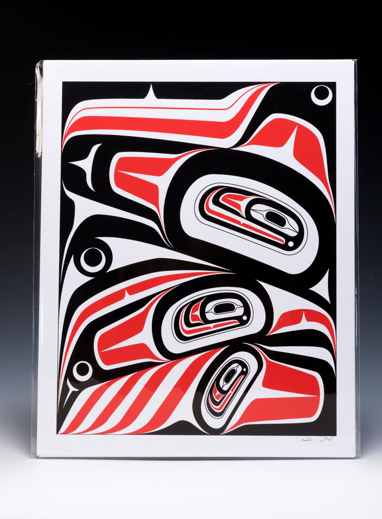 Tlingit Society is divided into two halves, the Eagles and the Ravens. The Raven is a primary character in Tlingit history. In the stories Raven is a Trickster character with the ability to transform. This print depicts Raven in mid-transformation.